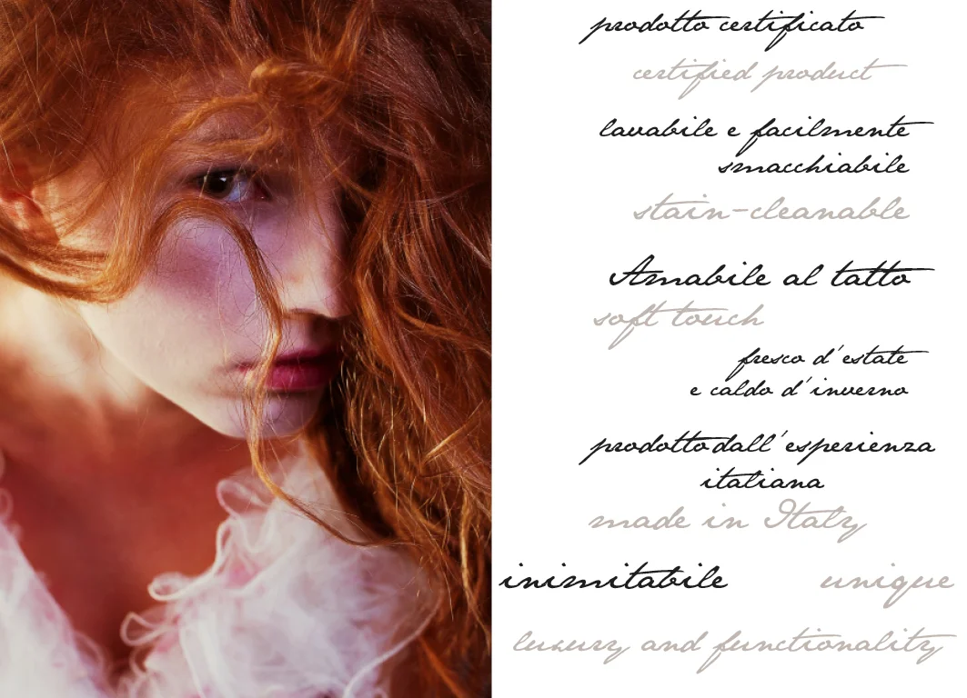 Studiato seguendo le più avanzate tecniche tessili, Deus risulta estremamente soffice ed accogliente al tatto, è facilmente smacchiabile grazie alle sue proprietà intrinseche strutturali ed è amico dell’ambiente perchè le sue fibre non sono di origine animale.